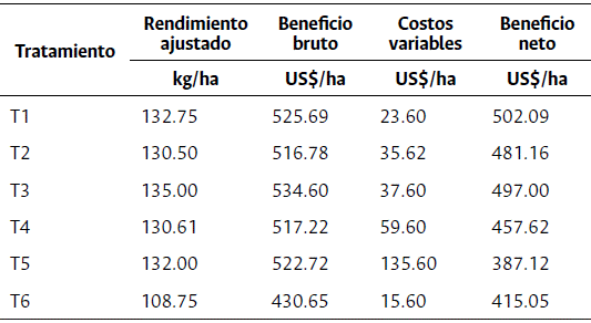 El tratamiento T3 mostró mayores rendimientos promedios, pero T1 reflejó el mayor beneficio neto; el menor beneficio neto correspondió al T5, debido a mayores costos variables.