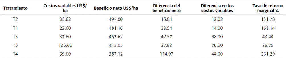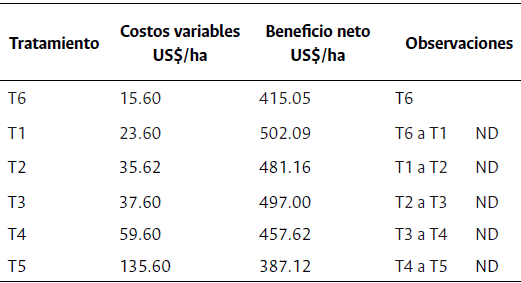 Mediante el análisis de dominancia realizado indico que ninguno de los tratamientos evaluados fue dominado por el tratamiento seis o testigo absoluto (Tabla 5).