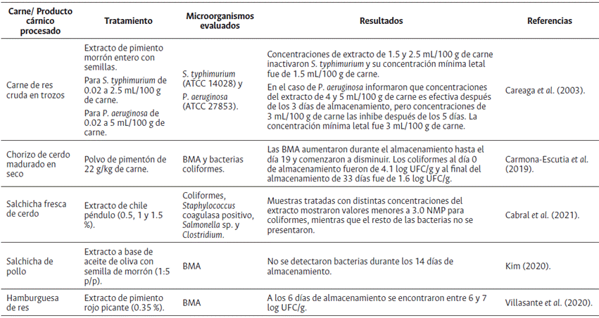 Tabla 3: Actividad antimicrobiana in situ de compuestos fenólicos del chile en productos cárnicos