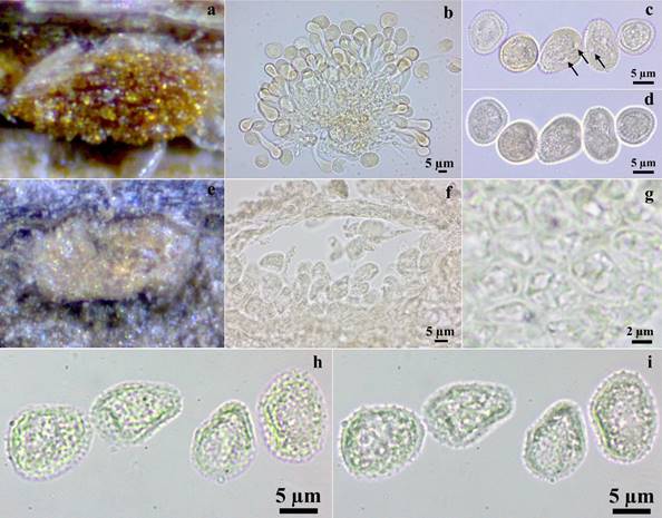 Figura 1: a-d. Puccinia digna. a. Uredosoro. b. Paráfisis. c-d. Uredosporas. c. En vista mediana con poros dispersos (flechas). d. En vista superficial. e-i. Pucciniastrum circaeae. e. Uredosoro. f. Sección transversal del uredosoro. g. Células peridiales. h-i. Uredosporas. h. En vista mediana. i. En vista superficial.