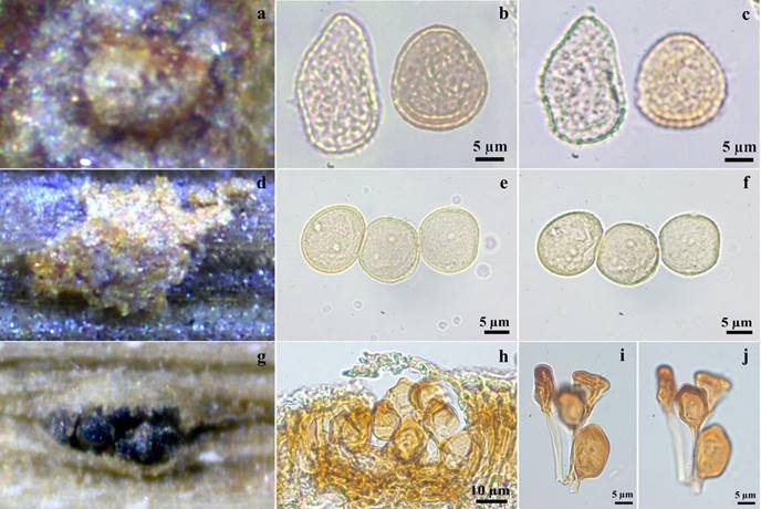 Figura 2: a-c. Uredo chrysophyllicola. a. Uredosoro. b-c. Uredosporas. b. En vista mediana. c. En vista superficial. d-j. Uromyces sporobolicola. d. Uredosoro. e-f. Uredosporas. e. En vista mediana con poros germinativos ecuatoriales (flechas). f. Uredosporas en vista superficial. g. Teliosoro. h. Sección transversal del teliosoro. i-j. Teliosporas. i. En vista mediana. j. En vista superficial.