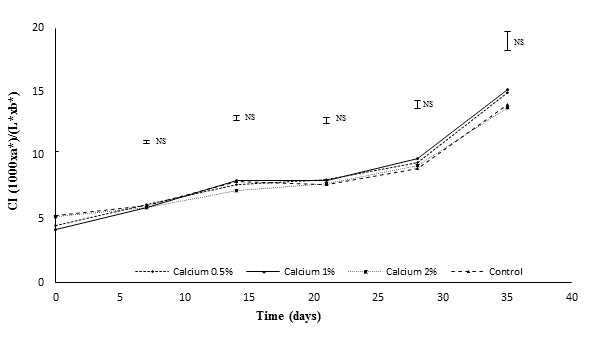 The value of the color index (CI) increased during the storage of the fruits, without significantly differences. Color changes in Cape gooseberry fruits are due to chlorophyll degradation, accumulation of carotenoids and exposure of pigments formed during maturation (Ferrer, Remón, Negueruela, & Oria, 2005). The results agreed with the findings of Ernani, Dias, Amarante, Ribeiro, & Rogeri. (2008), who reported applications of 0.5% CaCl2 at different frequencies (0, 4, 8, 12 times.year-1) on apple trees, did not present significantly differences in the fruit quality in terms of firmness, TSS, TTA, starch content and color.