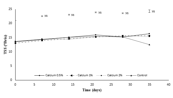 The treatments performed significantly differences respect to the control. The application of 0.5% CaCl2 exhibited and average values of 16.32 and was the treatment with the highest sugar content, in agreement with Gastelum-Osorio, Sandoval-Villa, Trejo-López & Castro-Brindis (2013). According to Menéndez, Lozano, Arenas, Bermúdez, Martínez, & Jiménez (2006), an increase in TSS occurs due to the starch hydrolysis and polysaccharides of the cell wall, giving rise to soluble sugars (Figure 4).