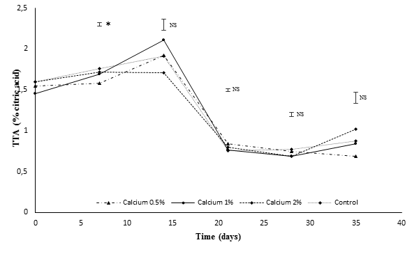 The acidity increased over time, from the beginning of storage and up to day 14, showing a significantly difference. In addition, it decreased until the last day of the postharvest period, resulting from the progress of the maturation process due to organic acids are used as substrates in respiration or are converted into sugars throughout gluconeogenesis, meaning maturation leads to a fall in acidity (Lanchero, Velandia, Fischer, Varela, & García, 2007). This result agrees with the findings of Amézquita et al., (2008), who reported the application of calcium, favors the postharvest life of Cape gooseberry fruits due to a higher acid content at harvest time which results in a longer shelf-life.