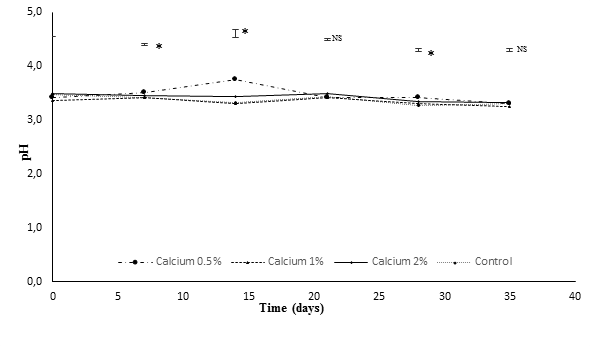 The treatments performed significantly differences. The highest value was obtained with the application of 0.5% CaCl2, while the lowest value was 1% CaCl2. A decrease in the pH value was observed throughout the postharvest period, indicating the degradation of some acids (Marschner, 2002). This behavior possibly occurs due to higher concentrations of calcium in fruits, enable a reduction of the polygalactunorase activity and, therefore, smaller increases in the pH levels (Marschner, 2002). With storage at room temperature, the pH values increased during the experiment, which, according to Ramirez et al., (2005), was due to the higher temperature, which increases respiration rates, and other metabolic processes will be greater than in fruits stored at low temperatures.