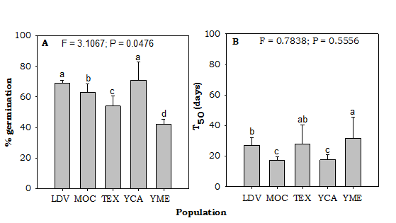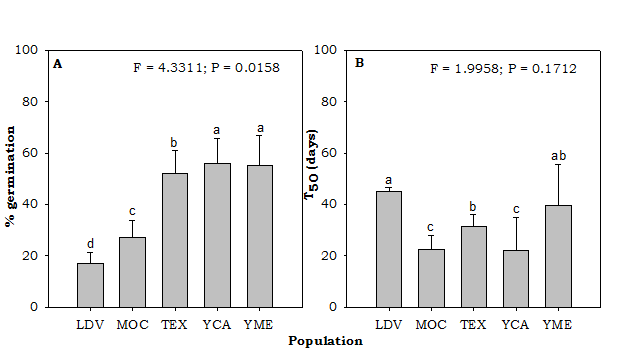 In natural growth conditions with 100 % of sunlight, the incubation temperatures showed not any significantly differences in both variables of germination: at constantly temperature, there were significantly differences in the final percentage germination, the mean germination time not showed any significantly variations among populations (Figure 3). The Yecorato Camino population showed a highest final percentage germination (71.0 %), whereas the Yecorato Mezquite population performed the lowest percentage (42.0 %) (Figure 3A).
