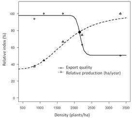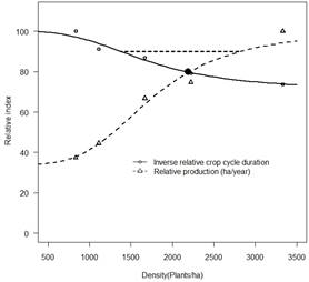 Figure 1: Effect of plant density on relative yield and inverse relative life cycle (Time from planting to harvest).