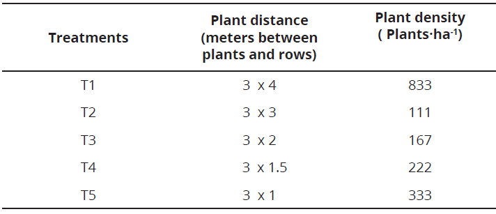 Twenty experimental units were used, within an area of 360 m2 (15 x 24 m). 30 plants were used as an experimental unit in treatment 1, 40 in T2, 60 in T3, in T4 and 120 in T5 for five plants evaluated at least.