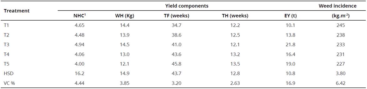 Table 2, shows the variance analysis, variation Coefficients (VC) and Tukey test results. Variance analysis shows the yield components and weed incidence performance with significant values (Table 2).