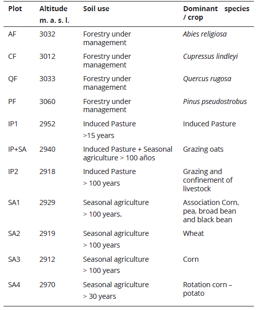 With the aim of including natural and productive systems and subsystems more representative of the evaluated area, a delimitation of the current soil uses was undertaken. Three conditions of soil use (forestry, induced pasture and agriculture) were obtained, as were eleven variants, all of which were found in soils originating from volcanic ash (humic andosols) among 2912 and 3060 m. a. s. l., four of these variants corresponded to forestry use (AF, CF, QF, PF) according with dominant species, four to seasonal agriculture (SA1, SA2, SA3, SA4), and three to induced pasture (IP1, IP+SA, IP2) (Table 1).