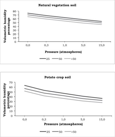 In the deepest soil sample (>50 cm), the following variations in edaphic parameters were found: under potato crop soil, ρb was 0.76 g.cm-3 compared with only 0.28 g.cm-3 under natural vegetation soil. Carbon sequestration under potato crop soil (3.91%) was six times less than under natural vegetation soil (26%). Silt content was much higher under natural vegetation soil (97.5%) than under potato crop soil (64.20%). On the other hand, sand and clay content, were higher under potato crop soil than under natural vegetation soil. Volumetric humidity percentages, under pressures among 0.3 and 15.0 atmospheres were: 23% to 40% lower under potato crop soil than under natural vegetation soil (Figure 1). All of these parameters above mentioned, except pH, P, Al and CEC varied significantly among two soil uses.