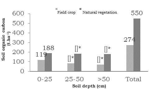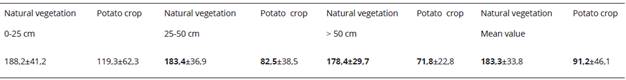 The mean SOC for every soil depth was twice as high under natural vegetation (183t.ha-1) than under influence of the potato crop soil (91.2 t.ha-1). Comparisons of SOC among soil depth estimations within each soil use, revealed no significantly differences.