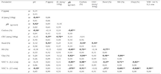 Abbreviations: mean ± STD, phosphorus (P), aluminum (Al), bulk density (ρb), cation interchange capacity (CEC), volumetric humidity percentage measured in atmospheres (VHC), numbers in bold are statistically significant at p<0.05* and p<0,01** ; Spearman's correlation coefficient (SC), level of significance (p).
