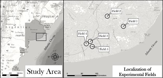 A total of 5 farm fields located in the southeastern of the Buenos Aires province were selected to explore the relationships among effective soil depth and those predictor variables related to factors of soil formation (Figure 1, Table 1). The area studied was 280 hectares. The soils are classified as Typic Argiudoll and Petrocalcic Argiudoll (USDA Taxonomy) ().