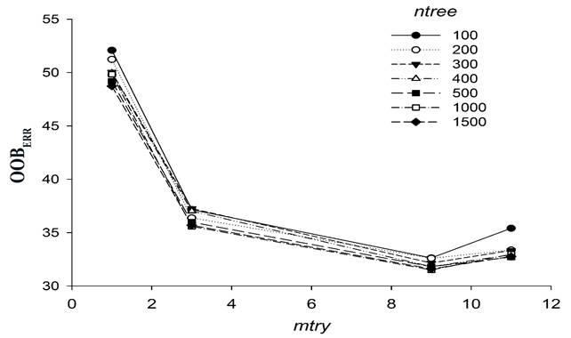 Figure 2, summarizes the simultaneous evaluation OOBEER from mtry and ntree tested. It was evident the effect of mtry increment on OOBEER . When mtry increased, OOBEER decreased from 50% (mtry=1) to 32% (mtry=9). Changes in OOBEER indicate the importance of additional variables. RM model with mtry higher than 9 incremented OOBEER and can generate an over-fit model (Breiman, 2001). The effect of ntree was lower than mtry. RF models with ntree higher than 500 showed more stability.