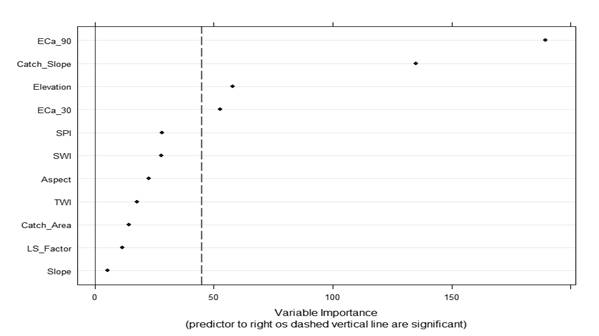 Our results suggested that the limit absolute value between relevant and irrelevant variables is 45 (dashed line - Figure 3). According to that, those most important predictors of effective depth were ECa_90, catchment slope, elevation and ECa_30.
