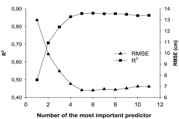 ) and root mean square error (RMSE) of Random Forest once less important predictors were removed.