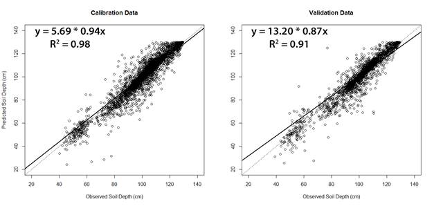 Figure 5, shows the prediction performance of simplified RF model applied to CD and VD. Our results suggested that simplified RF model demonstrated a potential application to ESD prediction. However, its use in others fields is limited for different reasons: (i) a high variability in depth, thickness and CaCO3 density of tosca at short distance, (ii) the relationship between tosca and argillic horizon and (iii) the anthropic effect. It is widely known that the southeast of Buenos Aires province is an outstanding zone due which income depends on agricultural production. Due to that, common suitability land processes such as terraces, crop management zones and drainages had been valuable. Generally, these could affect the spatial pattern of ECa as well as geomorphometric indices and therefore, increase error of simplified RF model developed.