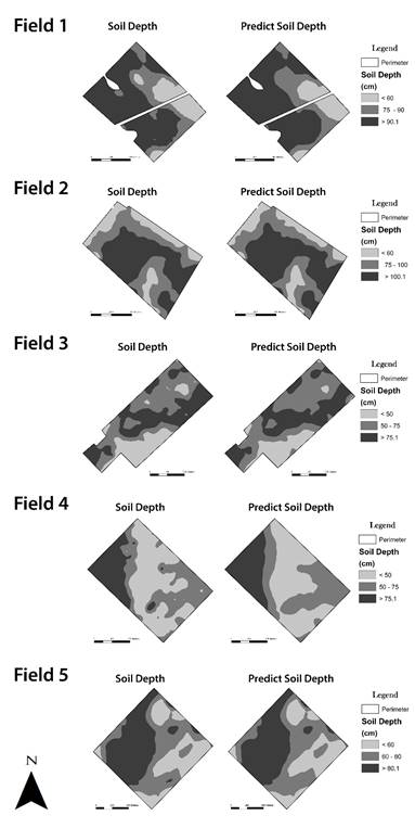 Figure 6, shows maps of effective depth made from simplified RF model development and ESD interpolation. Simplified RF model determined similar spatial patterns of ESD as interpolation technique did. Based on our result, we could validate that RF may be an effective and practical tool to select and predict ESD. However, although this RF model would not have the same performance for all fields, further studies will improve that.