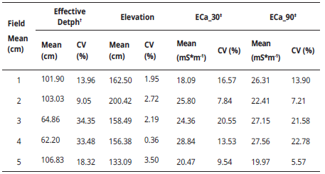 A total of 65% of ESD values were among 75 and 100 cm. Lower ESD means were observed in fields 3 and 4. Ranges of ECa were associated to non-saline soils conditions for all fields (Rhoades, 1996). According to their CV, ECa and ESD seemed to have a similar tendency. Fields 1 and 2, had a lower CV. Both are located in a hill zone, whereas fields 3, 4 and 5 are in a plain area.