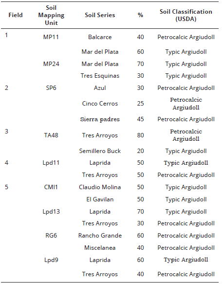 Table 3, shows the properties for each soil map unit and its proportional soil series composition for each field. This information could be used as complement information about understanding the spatial patterns of predictors.