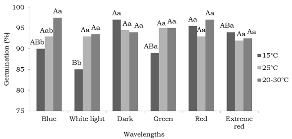 Tested temperatures did not differ among them in all wavelengths evaluated, except in the blue wavelength and white light, which when associated to temperatures of 25 and 20-30ºC provided higher performance to seeds compared to seeds incubated at 15ºC (Figure 1).