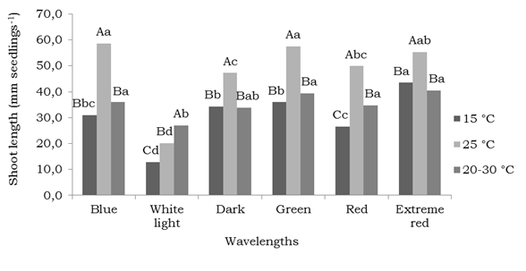 Niger seedlings growth was more sensitive to higher temperatures and qualities of light than the seed germination (Figure 2). The temperature of 25 ºC is associated to the wavelengths, which provided the highest results of shoot length (48.06 mm), except in the white light, where the higher shoot length was observed in alternating temperature of 20-30 ºC (26.93 mm).