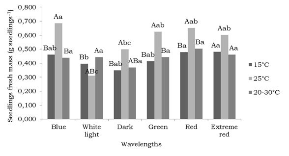 The temperature of 25 ºC provided the best results of seedlings in terms of the fresh mass in all evaluated wavelengths (Figure 4).