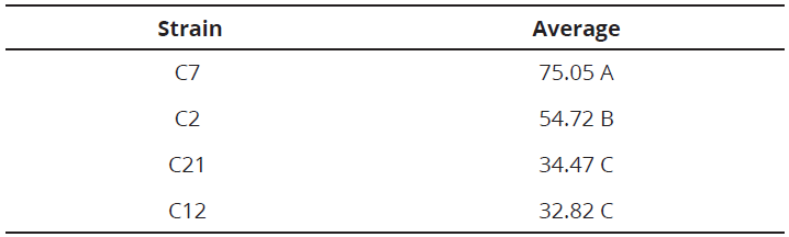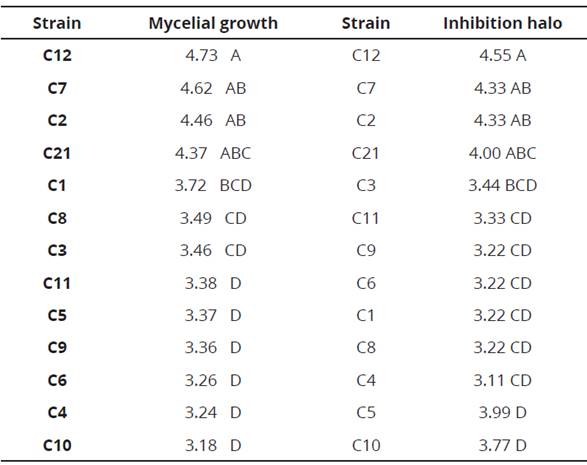 Mycelial growth and inhibition halo were different among strains. Isolates C12, C7, C2 and C21, showed the best behavior, presenting a mycelial growth, which varied between 4.73 and 3.72 cm, exceeding C11, C5, C9, C6, C4 and C10, with averages below 3.40 cm (Table 2).