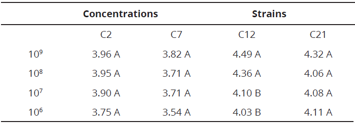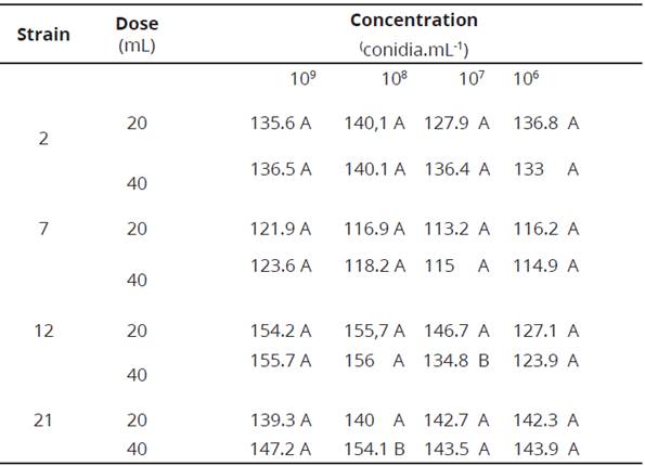 It is important to note there were no significant differences among C2, C7 and C21 strain concentrations (Table 4), whereas in the C12 strain, the 108 and 109 concentrations with averages of 4.36 g and 4.49 g, showed significant differences on the 106 concentration, which reached an average of 4.03 g. With the exception of C12 strain, 106, 107, 108 and 109 concentrations, had similar behavior in each of the strains under evaluation, suggesting that it is not necessary for these three strains (C2, C7 and C21) to increase the Trichoderma concentration beyond 106 conidia.mL-1.