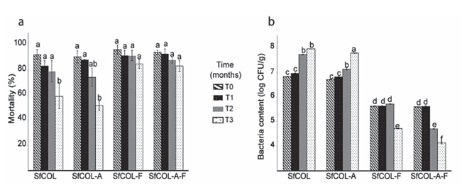 Figure 1. : Storage assays of mortality % (a) and bacterial contamination (b) at 0 (T0), 1 (T1), 2 (T2), and 3 (T3) months at 35ºC of both unformulated (SfCOL and SfCOL-A) and formulated (SfCOL-F and SfCOL-A-F) viruses. Bars labelled with identical letters were not significantly different for comparisons between treatments within each time storage (repeated measures ANOVA with intra-subject pairwise comparison of estimated marginal means, P > 0.05 Bonferroni correction).