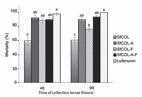 Mortalities obtained with unformulated and formulated treatments at two different times were evaluated on maize plants under greenhouse conditions (Figure 2). Larval mortality obtained with SfCOL was significantly lower than obtained with others treatments at 48 and 96 hours (F4,20=15.14, p=0.001). No differences were observed among formulated treatments (SfCOL-A-F and SfCOL-F) and unformulated SfCOL-A at 48 and 96 hours (treatment*time interaction F1=0.40, p=0.53), being larval mortality with SfCOL-A (formulated and unformulated) higher than 90% as found with evaluated chemical insecticide (>98 %).
