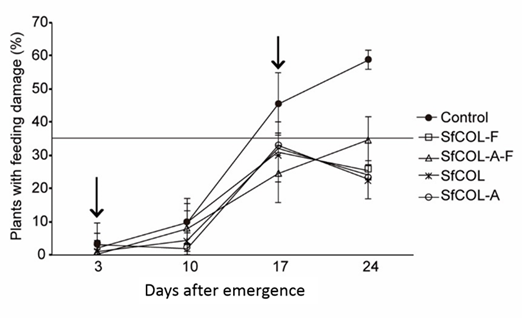 Figure 3: Percentage of maize plants showing S. frugiperda fresh feeding damage after applications of SfCOL and SfCOL-A both unformulated and formulated in 30F32 Pioneer maize plot. The line indicate the economic injury level for S. frugiperda on maize in Colombia (35%). Vertical arrows indicate the moment of application of treatments