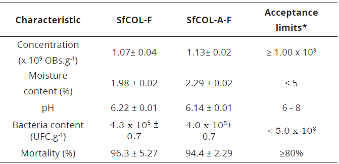 All analyzed parameters of formulated samples were within the acceptance limits described by Gómez et al., (2013) (Table 1). The results were similar in both formulated SfCOL-F and SfCOL-A-F wettable powders. Active ingredient concentrations in wettable powders were close to 1.0x109 OBs/g for both evaluated viruses. Moisture content and pH values ranged between 1.98% and 2.29% and between 6.22 and 6.14, respectively. Bacterial contaminants were close to 4.0x107 CFU/g and efficacies reached 96.3 and 94.4% for SfCOL-F and SfCOL-A-F respectively.
