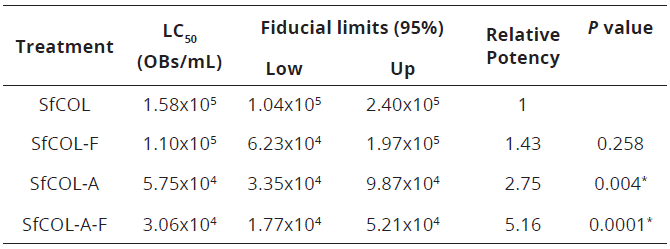 Table 2: Estimated LC50 and relative potencies values of SfCOL and SfCOL-A OBs both unformulated and formulated (F) in S. frugiperda second instars