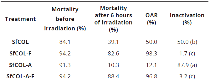 Initial insecticidal activities for all treatments were not significantly different (F3,8=2.42, p=0.14), providing mortalities > 84% (Table 3). OAR after six hours of irradiation decreased significantly when the isolates were not formulated (treatment*time interaction F9,24=2.791, p=0.022). No significant differences were observed among efficacies of formulated isolates at different irradiation times (p=0.054). The OAR percentage of SfCOL-A (12.1 %) was lower than obtained for SfCOL (50%) after six hours (P<0.001).