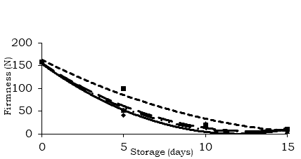 Accordingly to Vargas et al. (2006), the loss of fruit firmness during ripening is probably a result of the cell wall hydrolysis mechanism, which is related to increased activity of endogenous enzymes, which break down pectin material, or the reduction of turgor pressure, which diminishes with loss of water or dehydration caused by tissue perspiration during storage.