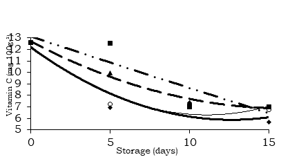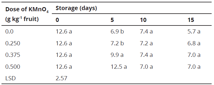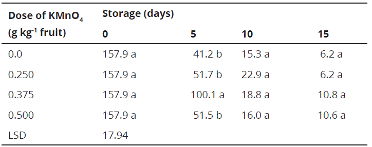 In all treatments, vitamin C decreased over time of storage (Figure 2), the doses of 0.375 and 0.500 g of potassium permanganate providing larger retardation in vitamin C reduction during storage, and more effective to fifth day of evaluation (Table 3).