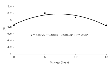 The pH had a small change, increasing until the eighth day of storage, followed by a reduction by the end of the experiment (Figure 4), a variation which agreed with observed in the titratable acidity. Morais et al. (2006b), studying sapodilla cultivars storage at room temperature, also observed a slight variation of pH and the titratable acidity.