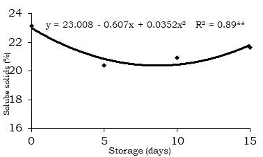 The soluble solids had a small decrease over storage time (Figure 5). This reduction can be attributed, in part, to the mobilization of soluble solids for breathing, consisting mainly by sugars (glucose, fructose and sucrose), organic acids and soluble pectins (Atta-Aly, 2003; Pelayo-Zaldívar et al., 2005).