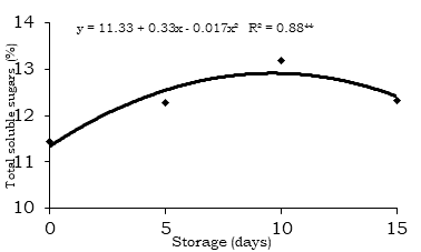 The soluble sugars increased until ten days of storage. After this period, there was a decrease (Figure 6).