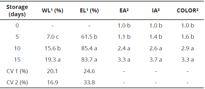 The loss of fruit weight reached about 20% after 15 days of storage, which compromised the fruit appearance which became wrinkled (Table 1).