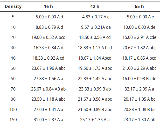 From a density of 50 eggs.predator-1, the age of eggs did not affect the predation by C. picanus; 5 (KW=0.32, gl=2, P=0,3679), 10 (KW=2.33, gl=2, P<0.1503), 20 KW=0.43, gl=2, P=0.7884), 30 (KW=4.76, gl=2, P<0.0913), 40 (KW=0.04, gl=2, P=0.9807) and 50 (KW=1.35, gl=2, P=0.5053). The Kruskal-Wallis test did not show significantly differences (P>0.05) for those prey densities (Table 2). Differences showed densities of 60 (KW=12.49, gl=2, P<0.05), 70 (KW=8.75, gl=2, P<0.05) and 100 (KW=8.54, gl=2; P<0.05) eggs.predator-1. The number of attacked eggs per capita was significantly affected by prey density for each egg maturity (16h: KW=54.87, gl=10, P< 0.0001), 42h: KW=43.23, gl=10, P<0.0001 and 65h: KW=46.31, gl=10, P<0.0001).