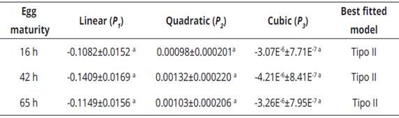 Where Y, is the dichotomous dependent variable, representing a non-consumed (Y=0) or consumed (Y=1) prey at the end of the trial, Na is the number of prey consumed, No is the number of prey available; and P0, P1, P2 and P3 are the intercept, linear, quadratic and cubic coefficient, respectively. Negative or positive significant linear coefficients (e.g., P1 ) indicate a type II or III functional response, respectively. The slope of type II response decreases (e.g., P1 is negative), while that slope of type III increases (e.g., P1 is positive). After determining the type of functional response, its parameters (attack rate and handling time) are estimated through linearization of Holling' s disc equation depending on the type of functional response (Xiao & Fadamiro, 2010). Type II equation was used: a and Th parameters were calculated using a nonlinear regression by least squares based on Gauss-Newton method (SAS Institute, Cary, NC, USA). The a/Th value indicates the effectiveness of depredation. The maximum depredation rate (K) was calculated as T/Th . To perform comparisons between a and Th parameters, standard deviation was estimated with 95% confidence interval using Jackknife statistical technique available in SAS (SAS Institute, Cary, NC, USA). Later, the parameters were compared using non-parametric Kruskal-Wallis test (α=0.05) due to heterogeneity of variances and non-normally distributed residuals.