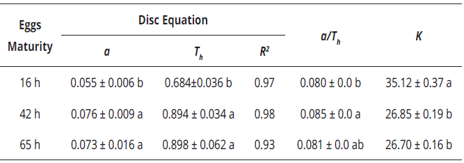 Table 4: Values of R2 and parameters (mean ± SE) of functional response of Cydnodromus picanus adult females on Tetranychus urticae eggs of different maturity times estimated by disc equation.