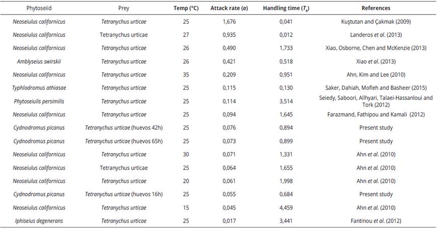 Cydnodromus picanus, showed a type II functional response for each maturity time of eggs. This type of functional response is registered for different phytoseiid especies, including: Amblyseius californicus (Mc-Gregor) (Gotoh, Nozawa & Yamaguchi, 2004); Neoseiulus longispinosus (Evans) (Rahman, Babu, Roobakkumar & Perumalsamy, 2012); Phytoseiulus persimilis Athias-Henriot, Galendromus occidentalis (Nesbitt) (Xiao & Fadamiro, 2010); Neoseiulus cucumeris (Oudemans) (Madadi et al., 2007). In general, the results obtained in this study for a and Th parameters of functional response for C. picanus are within the range of variation for different phytoseiid especies (Table 5).