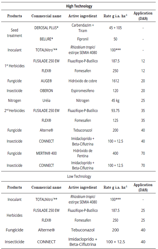 * Grams per treated 100 kg seed; ** Grams per 50 kg seed; DAS = days after sowing; *** Commercial product rate per hectare; 1 Product purchased from the company Total Biotecnologia (Curitiba, Brazil).