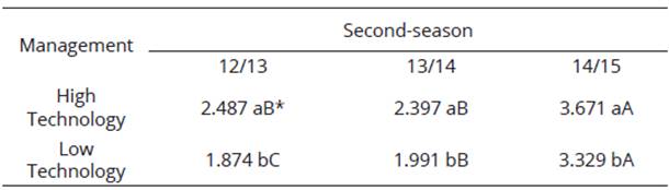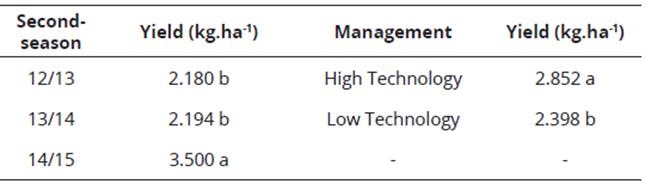 Analyzing separately each factor of the significant interaction, as for the years of cultivation for the average grain yield, in the second-season 14/15, there was higher yield, statistically different from the second-seasons 12/13 and 13/14 (Table 4). Again, the optimal weather conditions during the second-season 14/15 contributed to obtain high grain yield.