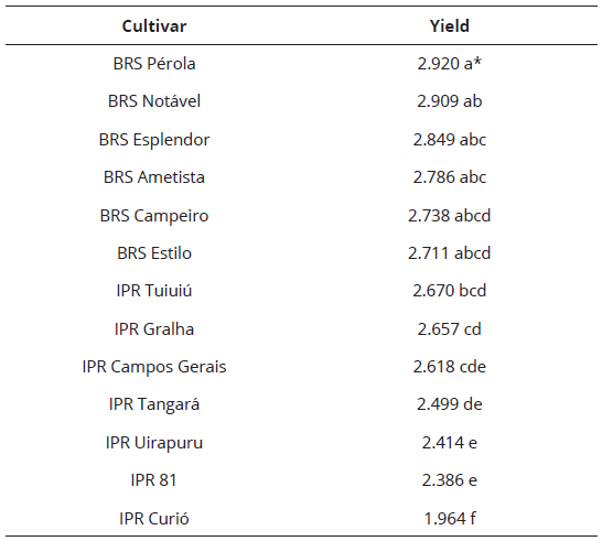 For the cultivar factor, the BRS Pérola was superior and statistically different from cultivars IPR Tuiuiú, IPR Gralha, IPR Campos Gerais, IPR Tangará, IPR Uirapuru, IPR 81 and IPR Curió, producing as much as the others (Table 5).