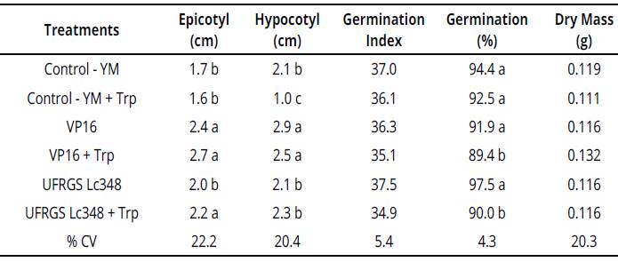 Averages of four replicates, each replicate consisted of 40 seeds. Averages followed by same letter in the column do not differ by the Scott Knott test at 5% error probability. Averages without letters in the column do not differ. YM: yeast manitol, Trp.: tryptophan, % CV= coefficient of variation percentage.
